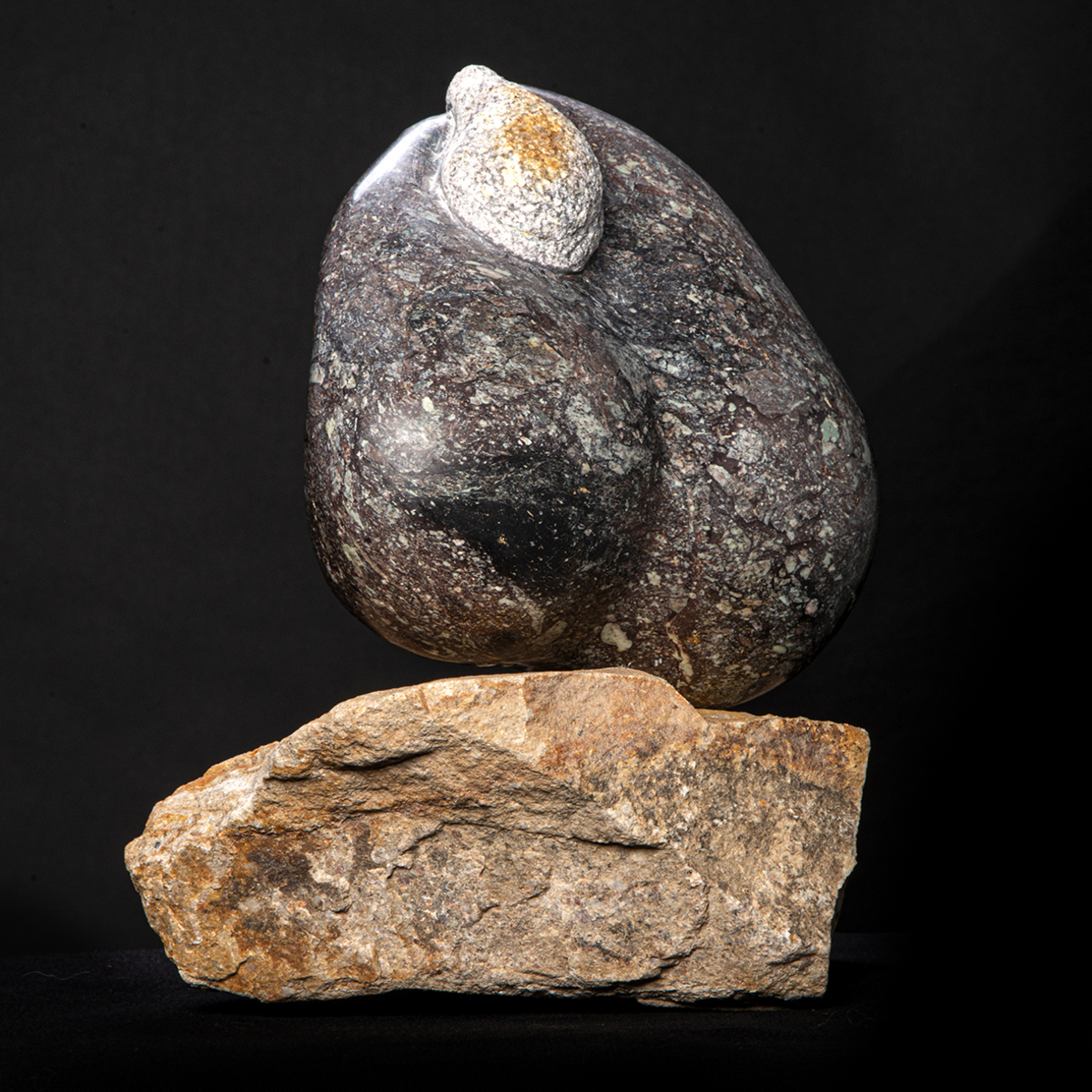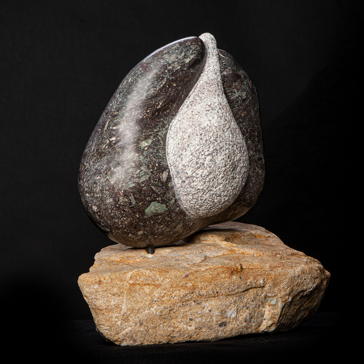 Rough and smooth contrast in this sculpture in cobalt serpentine. It gives strength and softness to this work. The sculpture is placed on a in Portugal found stone.