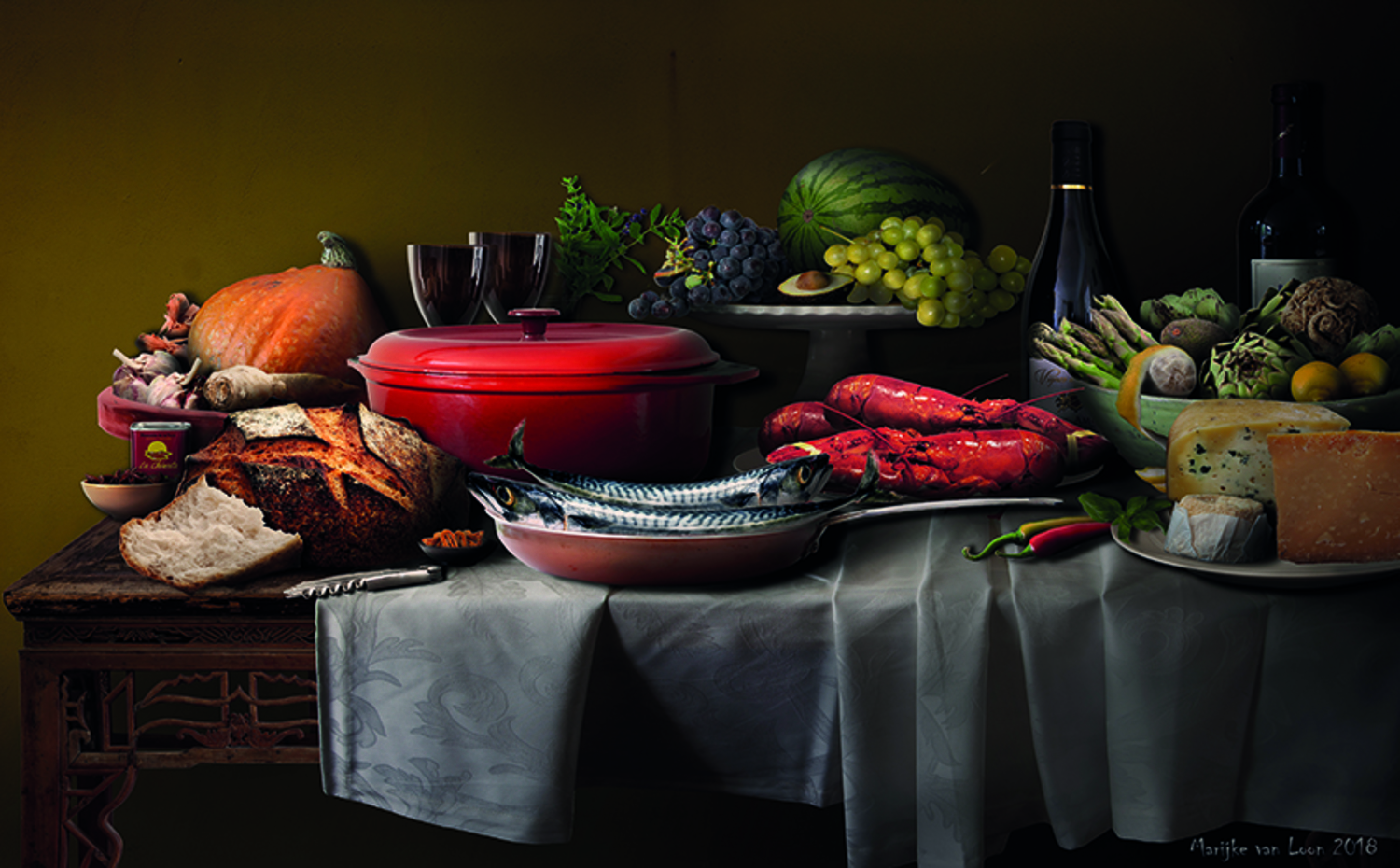 Still life with lobsters and mackerels. A table full of food, excess as in classic still lifes, but it also has a modern twist due to the modern elements such as the red pan that takes a central place