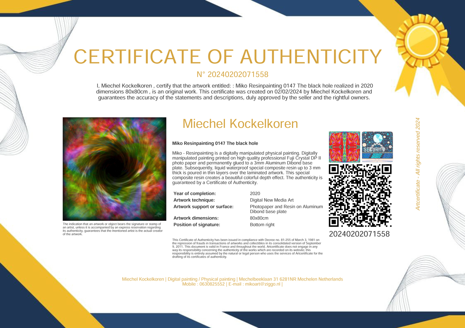 The authenticity and uniqueness of each Miko Digipainting are guaranteed and confirmed by the enclosed signed Certificate of Authenticity signed and dated in the lower right corner and the additional signature and year on the back of the artwork. The artwork and the certificate are inextricably linked. The certificate is also provided with Secure QR Code Seals and a VOID fraud-proof hologram.